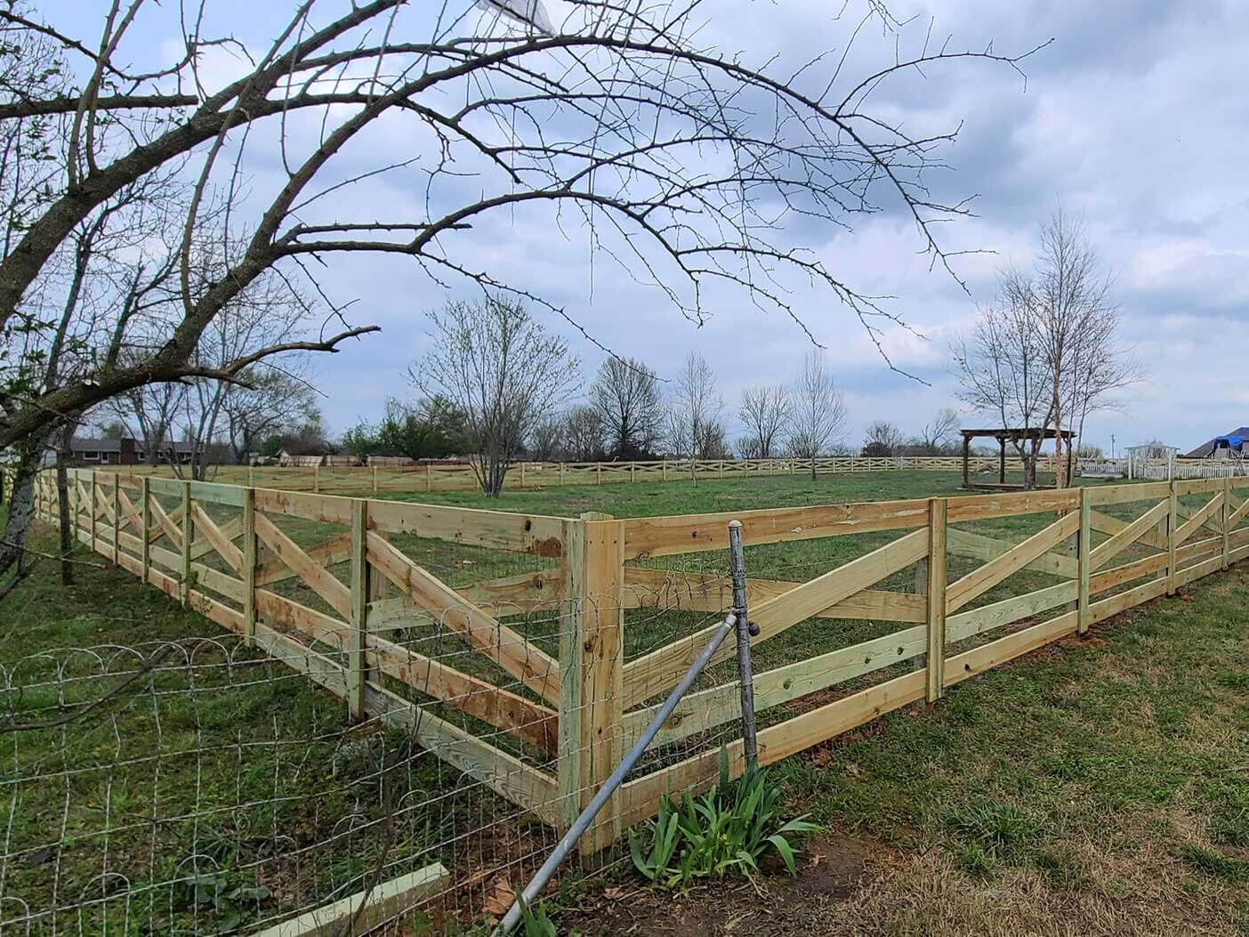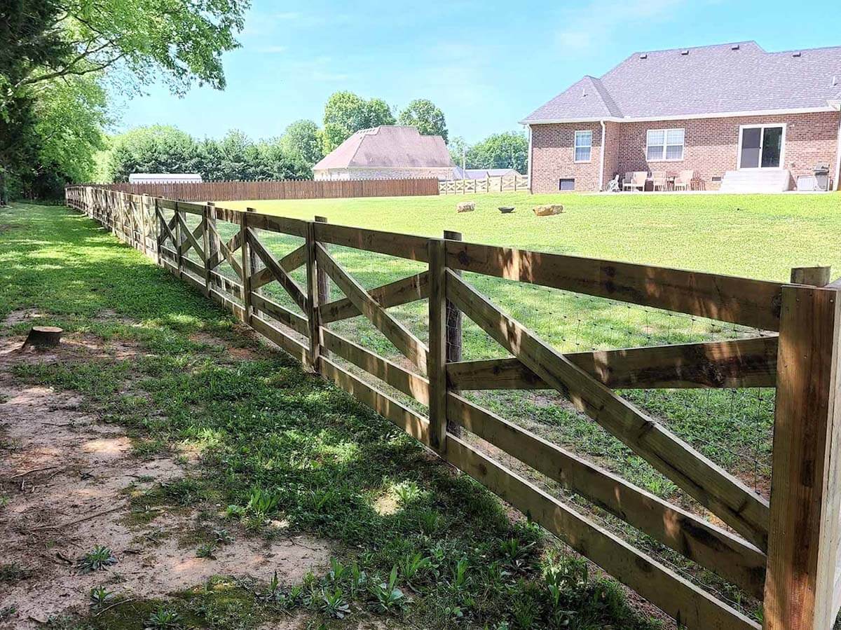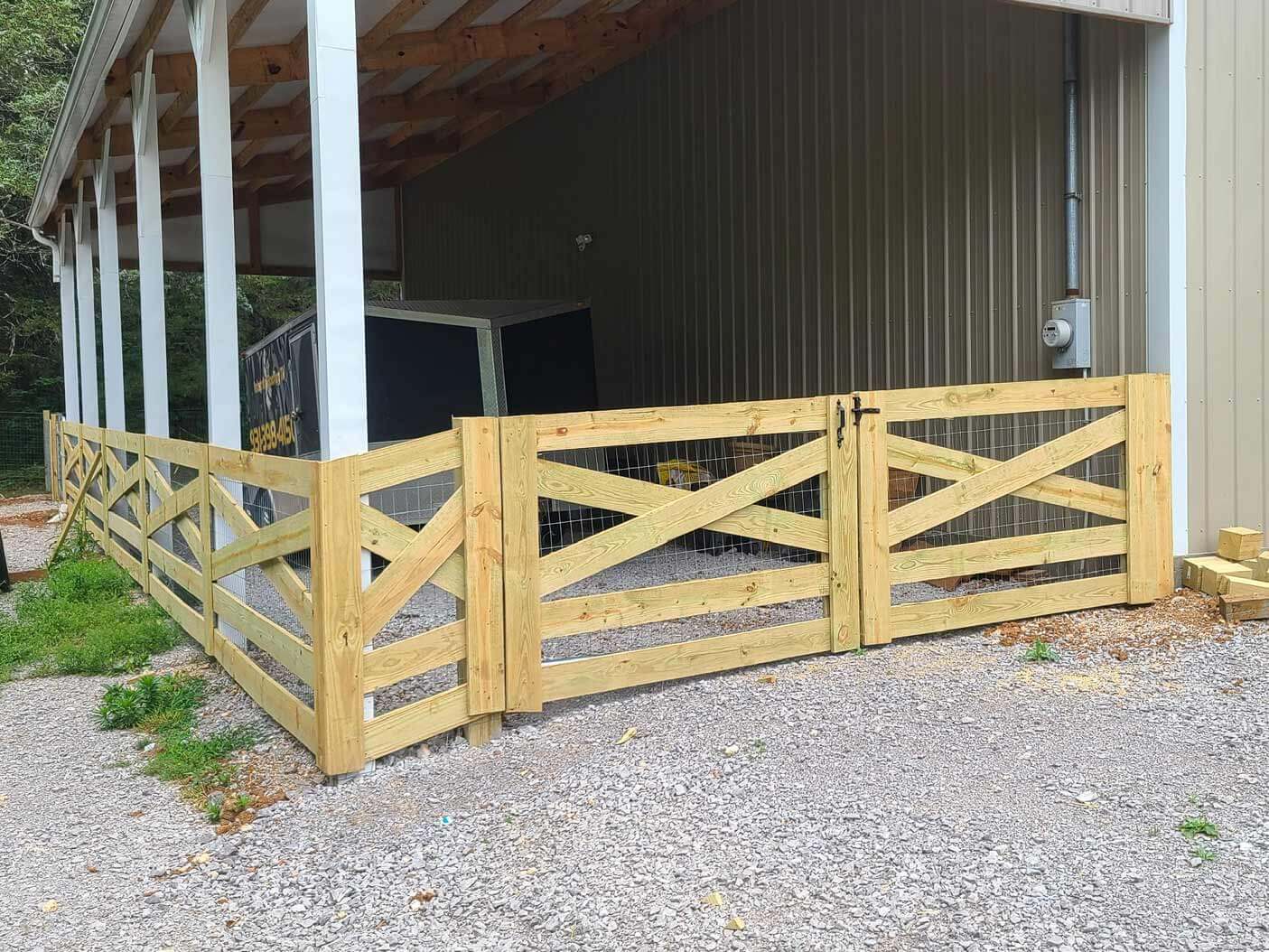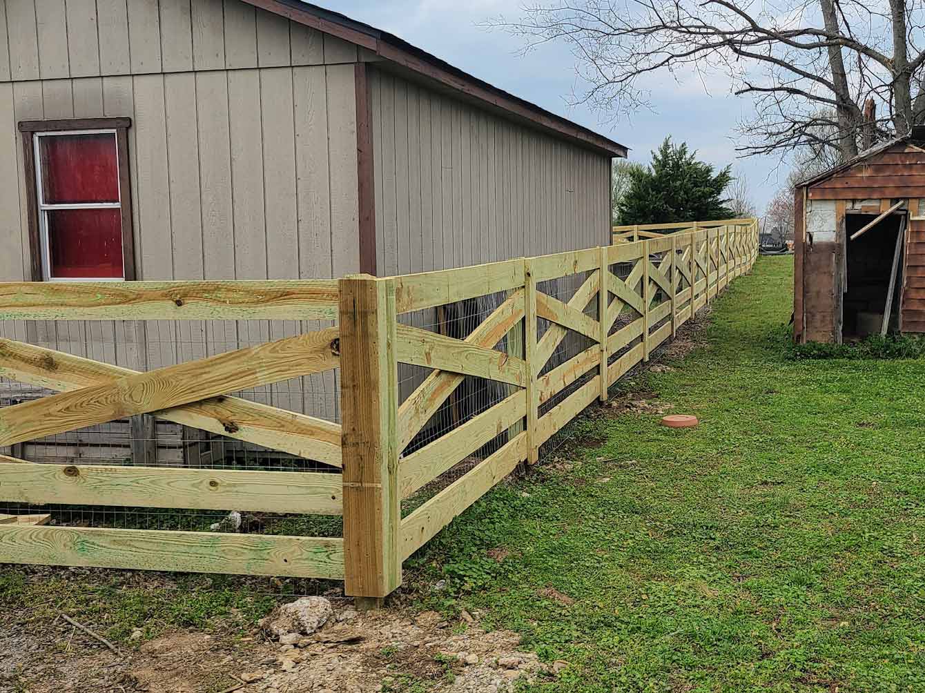 Crossbuck fencing combines farmland style with practical use. Available in 4- or 5-rail options, it defines boundaries, keeps animals contained, and adds charm to ranches, farms, or rural properties in Middle Tennessee.